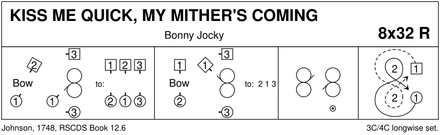 In the 1938 original edition of Book 12 the title of this dance was "Kiss Quick, My Mither's Coming"
