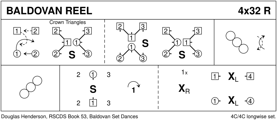 1– : 1c pass Rsh (2c dance up sidelines) to finish BtoB, 1M facing 3c and 1W facing 2c | ¾ of Crown Triangles (set to 1cnr+4cnr | to 4cnr+3cnr | to 3cnr+2cnr) 9– : Diagonal Reel4 with 2cnrs, pass Rsh 17– : Diagonal Reel4 with 1cnrs, at end pass Rsh to (2,1x,3,4) 25– : 1c set | cast off one (3c up) ; cross RH | 1c+4c change places LH (2,3,4,1)