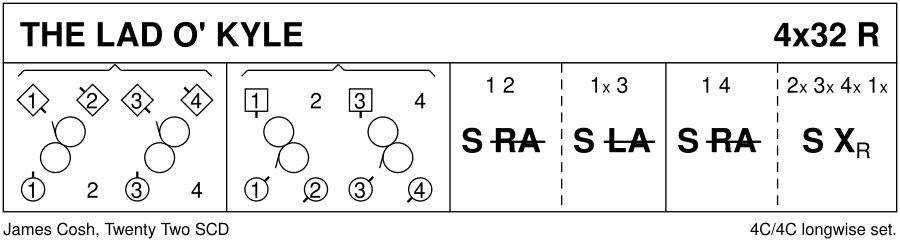 1-8 : 1s+2L also 3s+4L dance diagonal reels of 3 across 1s & 3s passing partners RSh to start (1L & 4L dance up side to start) 9-16 : 1s+2M also 3s+4M dance diagonal reels of 3 across 1s & 3s passing partners LSh to start (2M & 4M dance up side to start) 17-24 : 1s+2s set & dance 1/2 RH across, 1s+3s set & dance 1/2 LH across 25-32 : 1s+4s set & dance 1/2 RH across, all set & cross RH to own sides