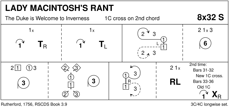 Strathspey · 32 bars · 3 couples (1x) · Longwise - 4 (Progression: 213) · Usual number of repetitions: 8