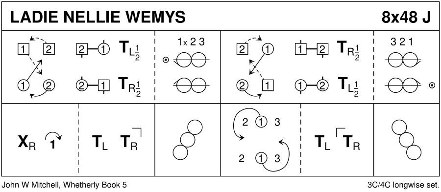 The dance has the title "Ladie Nellie Wemys" in the original book and uses a tune of almost the same name which is normally spelled "Lady Nellie Wemyss". The latter spelling is added as an alias. John Mitchell's daughter Alison writes: *John was a stickler for detail, and "Ladie" would not have been accidental. However, I can well believe that he took the name from a recording of the tune that just "happened" to use that spelling, instead of "Lady". Certainly, the two are equivalent; but the title is correct as originally published.*