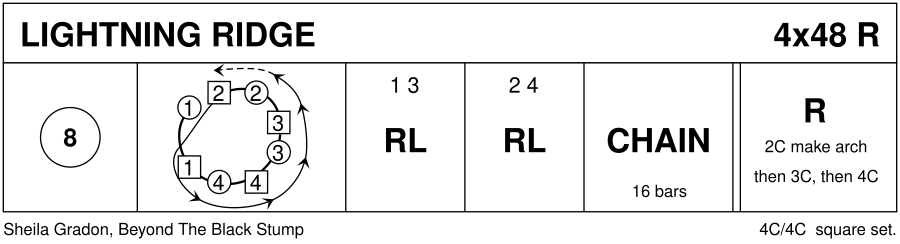 1– : Circle8 and back. Only 1M and 2W release hands 9– : All chase cclw, 2W leading under 1c's Arch 17– : 1c+3c R&L 25– : 2c+4c R&L 33–48 : Gr-Chain, 2 bars/hand *Note:* Repeat three times with 2nd, 3rd then 4th couple.