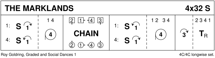 1-8 : 1s & 4s set, cast in 1 place **while** 2s & 3s step up/down to ends, 1s+4s circle 4H round to left 9-16 : All dance Grand Chain (2s & 3s cross RH to start) 17-24 : 1s+4s set, cast to ends **while** 2s & 3s step up/ down to original places. 1s+2s also 3s+4s circle 4H round to the left 25-32 : 1s cast to 4th place **while** 2s+3s+4s step up on bars 27-28 & all turn partners RH