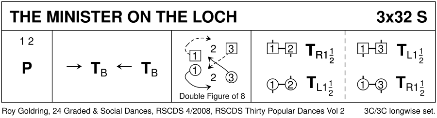 1– : 1c+2c Poussette 9– : 1c dance down 2 places, turn BH ; dance up 2 places, turn BH, open upwards and face out 17– : 1c+3c DblFig8 round 2c, 1c casting, 3c crossing up to begin, 1c finish facing out for 25– : 1W+2W & 1M+2M turn EH 1½ ; 1c+3c repeat (2,3,1)