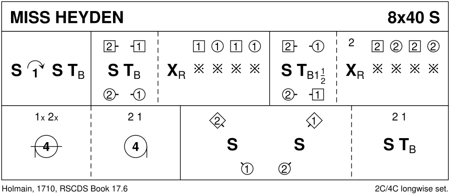 1-8 : 1s set, cast 1 place, set & turn 2H to face up 9-16 : 2L+1L also 2M+1M set & turn 2H, 1s cross RH & clap (1L on 1st beat of bars 15-16, 1M on 3rd beat of those bars) 17-24 : 2L+1M also 2M+1L set & turn 2H 1.1/2 times, 2s repeat bars 13-16 25-32 : 1s+2s circle 4H round to left 1/2 way & 4H once round to right to 2nd place own sides 33-40 : 2L+1M set, 2M+1L set, 2s+1s set & turn partners