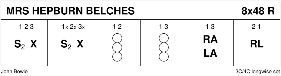 Derived from Pilling, the only source mentioned in DanceData. (DancaData includes the words »of Invermay« in the name; Pilling omits them). Comment on Strathspey, Fri, 15 Feb 2002 15:49:08 EST At the request of a long time dancer, I taught Mrs Hepburn Belches dance last night in San Francisco. Much to my surprise, I admit, the dance was a great deal of fun, although not at all easy. The initial crossings don't specify hands and it seems that using right both times is a fairly straightforward way to enter the first reel, but the only dancer to remember doing the dance pointed out that crossing by the left can involve a lovely little loop for 1st man and second lady to use to eat up the necessary time before entering the first reel of 4. Does anybody on the server have insights to offer about how this dance is/was done? Does anyone know for sure the reference in the title? Bruce Herbold Bherbold@aol.com San Francisco Branch