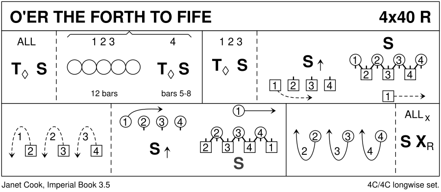 1-16 : All petronella turn & set, 1s+2s+3s dance reel of 6 passing partner RSh **while** 4s petronella turn to opposite sides & set 17-24 : 1s+2s+3s petronella to opposite sides & set, 2L+3L+4L advance to give RH to partner & LH to next Man & set **while** 1L casts to 4th pl (opp side) 25-32 : 2L+3L+4L dance LSh round Man on left back to opposite sides 1 place up, 2M+3M+4M advance to give RH to own partner & LH next Lady & set **while** 1M casts to 4th place (opp side) 33-40 : 2M+3M+4M dance RSh round partners back to opposite sides 1 place up, all set & cross RH