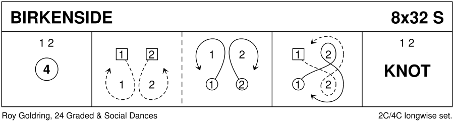 1-8 : 1s+2s circle 4H round & back 9-16 : 1L+2L cross between partners & cast back to places, 1M+2M repeat 17-24 : 1s dance Fig of 8 round 2s 25-32 : 1s+2s dance the Knot