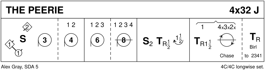 1-8 : 1s set to 2L & circle 3H round to left, 1s+2s circle 4H round to left 9-16 : 1s+2s+3s circle 6H round to left, 1s+2s+3s+4s circle 8H round to left 1/2 way 17-24 : 1s (in 4th place) set twice, 1/2 turn RH & lead up to top 25-32 : 1s turn 1.1/2 times **while** 4s+3s+2s chase clockwise to places, 1s turn to end in 4th place