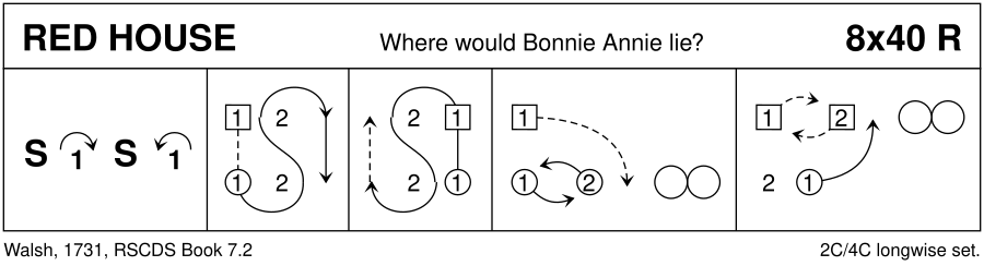 (or “Where Would Bonnie Annie Lie”) This is a double titled dance, the first “The Red House” being English, the second “Where Would Bonnie Annie Lie”, Scots. O where wad bonie Annie ly, Alane nae mair ye mauna ly; Wad ye a goodman try, Is that the thing ye're lacking. O can a lass sae young as I, Venture on the bridal tye Syne down with a goodman ly, I'm flee'd he'd keep me wauking. Never judge until ye try, Mak me your goodman, I Shanna hinder you to ly, And sleep till ye be weary. What if I shou'd wauking ly, When the hoboys are gawn by, Will ye tent me when I cry, My dear, I'm faint and iry. In my bosom thou shalt ly, When thou wakrife art, or dry, Healthy cordial standing by, Shall presently revive thee. To your will I then comply, Join us, priest, and let me try, How I'll we' a good man ly, Wha can a cordial gie me. Of the song and tune on which this dance was based, William Stenhouse stated: “This song was written by Ramsay, and printed in the first volume of his *Tea-Table Miscellany*, in 1724, under the title of ‘THE CORDIAL, to the tune of *Where shall our Goodman ly*.’ One stanza of the foolish old song runs thus: Where shall our goodman lie, O, where shall our goodman lie; Where shall our goodman lie, Till he shute o'er the simmer? Up amang the hen-hawks, Up amang the hen-hawks, Up amang the hen-hawks, Amang the rotten timmer. “This tune appears in Playford's *Dancing Master*, 1657, under the title of ‘The Red House;’ and Gay selected it for one of his songs in *Polly*, beginning ‘I will have my humours,’ printed in 1729.“ Robert Burns used the tune for his song “The Rantin' Dog” which begins: O, wha my babie-clouts will buy? O, wha will tent me when I cry? Wha will kiss me where I lie? – The rantin dog, the daddie o't!