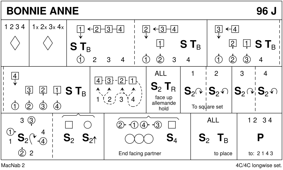 1-16 : All dance petronella round back to places 17-32 : 1L sets adv to 1M & turns 2H, 1L repeats with 2M, 3M & 4M, as 2L, 3L & 4L dance up 1 pl & repeat turning Men. Final turn 4L+1M, 3L+2M, 2L+3M, 1L+4M. Ladies now are on Men's side 33-40 : 1L followed by 2L, 3L & 4L weave 'out & in' on Men's side till 1L+2L are between 1M+2M & 3L+4L between 3M+4M, all dance across to place 41-48 : All set twice to partners & turn RH into Allemande hold in centre 49-64 : Each couple in turn sets advancing/turning to form a square set (4 bars each couple), 1s to 1st place facing down, 2s to 4th place, 3s to 2nd place & 4s to 3rd place 65-72 : Ladies continue setting **while** Men set dancing in & turning to face partner & 1M & 4M set twice facing partner as 2M & 3M set once & dance clockwise to face 1M/4M forming a line in centre for reel of 4. 2 1 4 3 73-80 : Ladies set **while** Men dance reel of 4 & end facing partners 81-88 : All set twice & turn 2H into longwise pstns 89-96 : 1s+2s also 3s+4s dance All Round Poussette (Popular variation - progressive Poussette & repeat dance from new positions)
