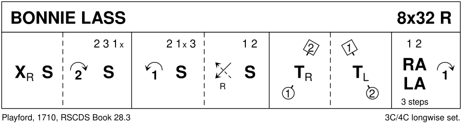 1-8 : 1s cross RH, set, cast to 3rd place & 2s+3s+1s set 9-16 : 1s cast up to 2nd place, 2s+1s+3s set on sides, 1s lead up to top, cross to original places & 1s+2s set 17-24 : 1M+2L turn RH, 1L+2M turn LH 25-32 : 1s+2s dance RH across for 3 steps, LH back & 1s cast to 2nd place as 2s lead up