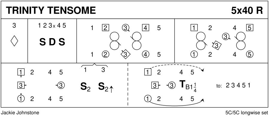1-8 : 3s dance petronella to opposite sides 9-16 : All set, dance DoSiDo & set 17-24 : 3s dance reels of 3 across, 3L with 2s (RSh to 2L) & 3M with 4s (RSh to 4M) 25-32 : 3s dance reels of 3 across, 3L with 1s (RSh to 1L) & 3M with 5s (RSh to 5M) & 3s end in centre at top/bottom facing down/up 33-40 : 3s set twice advancing towards each other & turn 2H ending in 2nd place own side **while** 1s set twice & cast to 5th place
