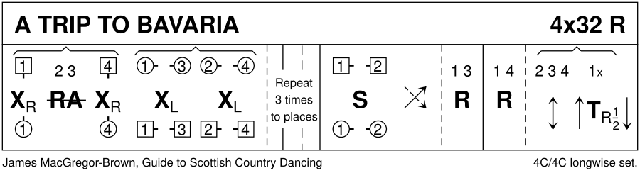 ##RSCDS-DI:omit-ta The dance has been dated 1960 by an original handwritten copy of this dance by James MacGregor-Brown owned by Stephen Webb. It should perhaps be added that the title of this dance was originally "Eine Reise nach Bayern". There is quite some discussion on details. Do 3c and 4c face up from bar 17 or only when they start setting? Does 1c switch sides RH or BH on bar 30? There were over 280 posts on "strathspey" Mailing List from the mid-1990s to recently. The deviser's original says "face across till you start setting" and "RH", but many local traditions keep to "face up from bar 17" and "BH". In a Strathspey "Q&A" from 2011 (see the URL below) the deviser says: > You asked me about a leaflet copy of A Trip to Bavaria. I could not refer you to one, as I have > never published it in anything other than the Collins book and the companion video, in which, as I > believe I may have mentioned, it is danced to the original tune; that is to say, mine. However, I’m > delighted that the group [i.e. TACBooks], to whose site you referred me, makes it available to > others who may enjoy the dance. Their leaflet does, as you point out, call for a two-handed turn. > > Just a word on that: > > Being, as they call it, “a full certificate teacher”, when “grooming” dancers for theatrical > presentations, I use my original deft almost surreptitious one, i.e., RIGHT hand turn. Ideally the > turn should be tight and fully effected, in the middle of the set, so that the impression is given to > the audience, of a preferably unnoticed “correction“ of side, for couple number one. > > HOWEVER... > > This nicety is not called for, when we are dancing just for pleasure and delight – what better > reason!? So, as I have already recommended, dancers should dance ‘that bit’ in whatever way > they like best. There is also a discussion on the tune. The deviser wrote a tune »A Trip to Bavaria / Eine Reise nach Bayern«, but he has not replied to requests (in 2011) for the notes or for a publication where it can be found. The deviser does not approve of the now mostly used tune "The Remmerts of Herford". For details see <<http://qa.strathspey.org/questions/5/whats-the-name-of-the-tune-for-a-trip-to-bavaria>> Eric Ferguson, 2012.