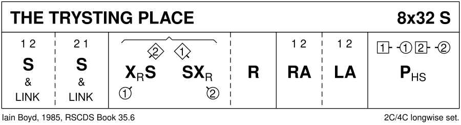 Notes from Book 35 ---------------------- The dance was devised by Iain Boyd, New Zealand, in 1985, and inscribed to Mary Murray of Vancouver B.C. Mary's former home in Falkirk, and still that of her parents, is in Tryst Road, opposite the traditional site of the Falkirk Tryst where cattle drovers from the Highlands, Lowlands and the north of England met to buy and sell their livestock and produce. The Highland Schottische poussette was created by Jackie Johnstone of Dumfries and was first used in his dance "S. S. Johnstone" (Loreburn Set Volume II). In that dance, the men start back to back in the middle of the line and so progression been modified for use in "Trysting Place". Notes extracted from elsewhere ----------------------------------- The "Falkirk Tryst" was one of the largest livestock markets in Scotland with farmers and buyers gathering from all over Scotland and beyond. At its height times as many as 150,000 cattle, sheep and horses were droved there. The tryst was held up to three times a year in August, September and October. With the arrival of the railroad, numbers declined until the late 19th century. Nowadays, you still have the annual Falkirk tryst fun fair here. For more also historical information on the Falkirk Tryst see <<https://falkirklocalhistory.club/around-and-about-the-area/themes/falkirk-trysts/|Falkirk Local History Society>>, <<http://ourstories.everyone-rs3.com/story/all-roads-lead-to-falkirk-gaelic-heritage-and-the-falkirk-tryst|Our Stories Falkirk>>, <<https://www.falkirkherald.co.uk/news/opinion/falkirk-tryst-cattle-market-fun-fair-998971|Falkirk Herold>> and <<https://en.wikipedia.org/wiki/Stenhousemuir#History|Wikipedia>>. Pronuncation --------------- The Scots pronuncation of “tryst”, according to the <<https://www.dsl.ac.uk/entry/snd/tryst|Dictionaries of the Scots Language>> is /trəist/. Don't let yourself be confused by English dictionaries online which usually specify /trɪst/.