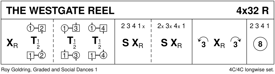 1– : 1c cross RH and face out | turn 2c ½ EH and face in ; turn 3c ½ EH | turn 4c ½ EH (2,3,4,1x) 9– : All set | cross RH ; all set | cross RH (1c face out) 17– : 1c cast to top, cross RH, cast off to bottom (2,3,4,1) 25– : Circle8 and back