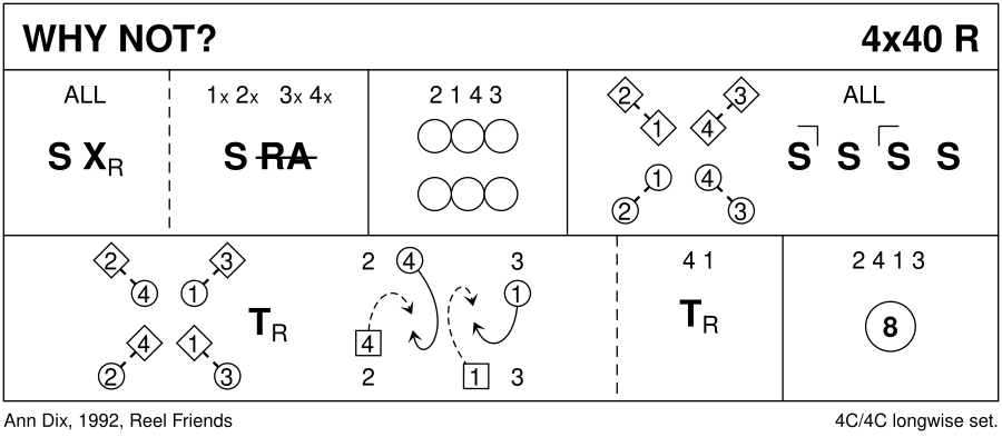 1-8 : All set, cross RH, set & 1s+2s also 3s+4s dance 1/2 RH across to end 2 1 4 3 9-16 : All dance RSh reels of 4 on sides to end with 1s & 4s BtoB in centre facing diagonally 17-24 : 1s & 4s dance "Hello-Goodbye" setting to end facing opposite corners 25-32 : 1s & 4s turn corners RH, pass partners RSh to end on own side & turn partners RH 33-40 : All circle 8H round & back