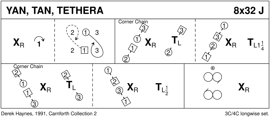 For Dennis and Rhoda Park, the Westmorland farmers who still count their sheep 'Yan, Tan, Tethera ...' On 13th may 2019 Robb Quint posted the following e-mail message on "Strathspey" about this dance: Many thanks to Sue Ronald of Edgewater, New Jersey, and Quorn, Leicestershire, for calling my attention to Derek Haynes's jig Yan, Tan, Tethera, which she was at that moment preparing to teach. Sue thoughtfully did so knowing of my interest in Celtic languages. Yan, Tan, Tethera, again also an SCD jig, is a remnant of the Brythonic which was spoken across the majority of Britain, including Scotland south to the Firths of Clyde and Forth, two millennia ago, and it means "one, two, three." Despite linguistic assault from from Anglic Northumbrian as well as Viking languages in the north of Britain and to some extent from Irish-import Gaelic as well as from Saxon in the south, Brythonic lived on in isolated locations in northern England and southern Scotland as Cumbric, though barely by then, into the 13th century, thereby likely the persistent existence of yan, tan, tethera, et al. (In the extremity of England's West Country Celtic Cornish held on until c. 1800.) Brythonic was likely fairly similar to the Pictish of central and northern Scotland that was gradually but ultimately overrun linguistically by Gaelic a millennium ago. What is left today of Brythonic is modern Welsh, spoken mostly in northern Wales, and Breton, the descendant language of the southern-Britain Celts who crossed the English Channel, bringing Celtic back to the European continent from which it had essentially disappeared, establishing themselves in French Brittany (thus that name for it) as they emigrated from an England being overrun by Saxon settlers from today's Netherlands and northwestern Germany. With Brythonic gone and replaced in northern England and southern Scotland by Germanic languages developing into English and Scots, shepherds though retained the Celtic numbers from one through twenty for the specific purpose of the important task of twice daily counting sheep. It was a sing-song-y (cf. today's children's alphabet song) specialty counting system for this particular use only, and it lasted into fairly modern times, enough so that linguists have been able to collect many different variations of it, which change slightly from one dale (valley) to another. Though they certainly exist in modern Welsh and Breton, numbers beyond twenty long ago disappeared from the shepherds' counting vocabulary. Reaching twenty the shepherd would simply move a finger down a notch on a staff or place another pebble in a pocket and start again with number one. Derek Haynes (1932-2005) was a prolific SCD deviser from Lancashire right in the midst of yan-tan-tethera territory. The Scottish-Borders variant of this (and remember that this is neither Gaelic nor Scots but rather a remnant of extinct Brythonic) runs as follows from one to twenty: yan, tyan, tethera, methera, pimp, sethera, lethera, hovera, dovera, dik, yanadik (1+10), tyanadik (2+10), tetheradik (3+10), metheradik (4+10), bumfitt, yanabumfitt (1+15), tyanabumfitt (2+15), tetherabumfitt (3+15), metherabumfitt (4+15), giggot. One can well imagine a shepherd reciting this for memory in a sing-song-y manner while counting sheep. Many centuries removed from a common Brythonic ancestor with the above, modern Welsh's 1-20 are as follows: un, dau, tri, pedwar, pump, chwech, saith, wyth, naw, deg, un ar ddeg, deuddeg, tri ar ddeg, pedwar ar ddeg, pymtheg, un ar bymtheg (again the +15 counting), dau ar bymtheg, deunaw, pedwar ar bymtheg, ugain.