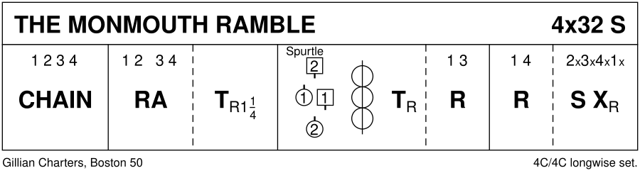 1-8 : All dance Grand Chain 9-16 : 1s+2s also 3s+4s dance RH across, 1s turn RH 1.1/4 times moving down the set to end RSh to RSh, Man facing 2L & Lady facing 2M 17-24 : 1s dance the Spurtle: 1s dance 1/2 reel of 4 with 2s & turn partner RH to face 3s, 1s dance 1/2 reel of 4 with 3s & turn partner RH to face 4s 25-32 : 1s dance 1/2 reel with 4s & turn RH to 4th place opposite sides, all set & cross RH 1s ending in 4th place