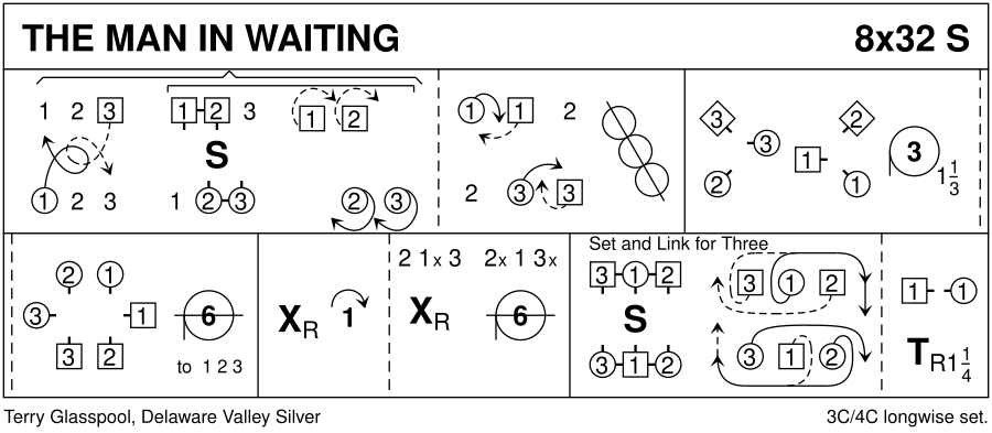 1–4 : 1M and 3W dance around each other R to end in partner's place facing out while 1W and 2W set and cast off and 2M and 3M set and cast up. 5–8 : 1s and 3s 1/2 RSh reel4 on 2nd corner diagonal. 9–12 : 2s LHA 1 1/3 with 1s or 3s. 13–16 : 6 hands round to the left to original places. 17–20 : 1s cross R and cast. 2s step up. 21–24 : All cross R. 6 hands round to the left 1/2. 25–28 : Set & link for 3. 29–32 : 1s turn R 1 1/4.