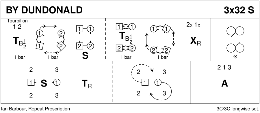 1-8 : 1s+2s dance the Tourbillon: : 1s & 2s turn partners 2H 1/2 way, 1M & 2L lead partners on 1 place clockwise to end 1s on Ladies' side & 2s on Men's side, 1s set to 2s : 1s & 2s 1/2 turn partners 2H, 1L & 2M lead partners on 1 place to end 2s in 1st pl & 1s in 2nd pl & 2s+1s cross RH to own sides. 1s face out 9-16 : 2s+1s+3s dance reels of 3 on sides (1s give RSh to person on right) & end with 1M facing up between 3s, 1L between 2s facing down 17-24 : 1s set, turn RH, 1L dances up between 2s **while** 1M dances down between 3s & cast to 2nd place on own side 25-32 : 2s+1s+3s dance Allemande