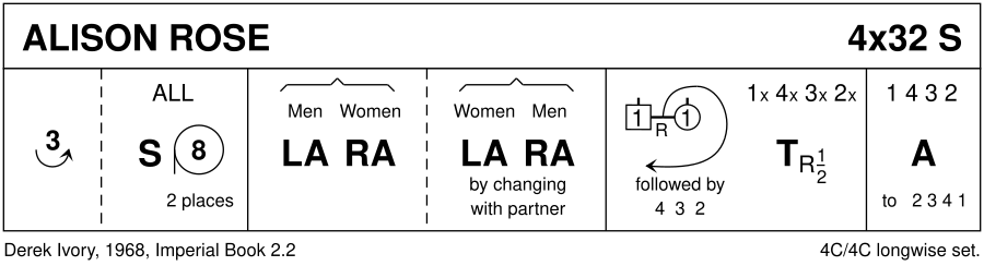 1-8 : 1s lead down to bottom, all set & circle 8H round to left 2 places (end with Men at top of dance & Ladies at bottom) 9-16 : Men dance LH across & Ladies RH across once round, continue but change places with partner when passing thru middle in order 1 4 3 2 17-24 : As 1s (+4s+3s+2s) meet again (Men drop RH) & leads his prtnr round to end 1s (followed by 4s+3s+2s) leading up to top, all 1/2 turning RH into… 25-32 : All dance Allemande ending 2 3 4 1