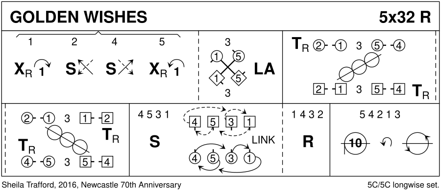 1-8 : 1s & 5s cross RH with partner & cast in 1 place **while** 2s & 4s set & cross up/down to ends; 1s & 5s dance LH across & face corners 9-12 : 2L+1L+5M+4M dance 1/2 diag reel of 4 (on 1st corner diagonal) **while** 2M+1M also 5L+4L turn RH ending facing 13-16 : 2M+1M+5L+4L dance 1/2 diag reel of 4 (on 2nd corner diagonal) **while** 2L+1L also 5M+4M turn RH. 4 5 3 1 2 17-20 : 4s+5s+3s+1s Double Set+Link: : **17-18** All set in pairs : **19-20** 4s & 1s cast 2 places (passing each other RSh) **while** 5s & 3s move to nearest end. 5 1 4 3 2 21-24 : 1s+4s+3s+2s Double Set+Link to end 5 4 2 1 3 25-32 : All circle 10H round to left (3 bars), pivot & chase back. 5 4 2 1 3