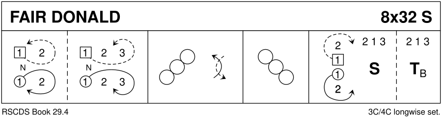 1– : 1c dance NHJ between 2c and cast up to top ; dance NHJ between 3c and cast up to 1cnrs (2c up on [7–8]) 9– : Reel4 with 1cnrs, at the end pass Lsh to face 2cnrs 17– : Reel4 with 2cnrs, finishing between 2c on own side, facing up NHJ 25– : 1c cast off one | 2c+1c+3c set ; all turn P BH