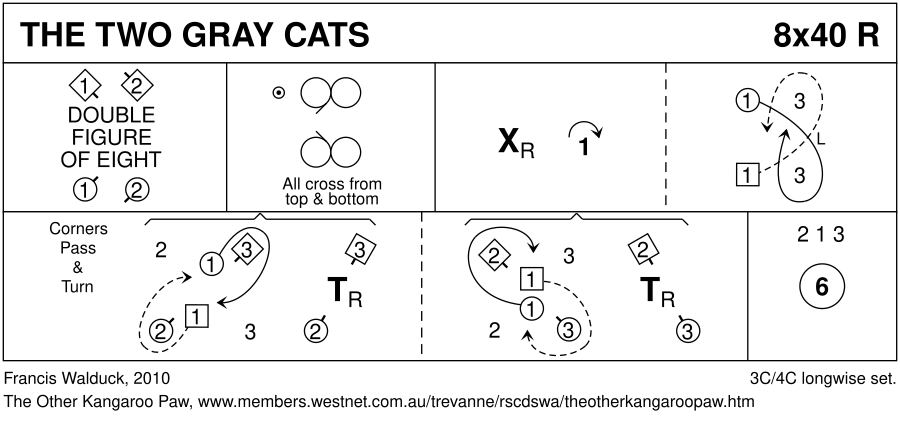 1- : 1c+2c DblFig8, 1c crossing down. 2c face out and up (1,2,3) 9- : Mirror Reels3 on sides, all couples crossing from top and bottom (1,2,3) 17- : 1c cross RH | cast off (2c up) ; cross down LH between 3c | cast up to face 1cnrs 25- : Corners Pass and Turn (2,1,3) 33- : Circle6 and back (2,1,3)