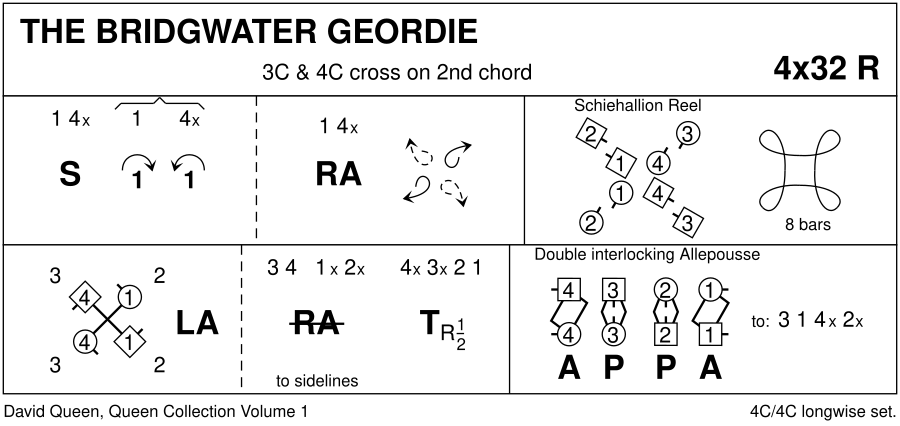 : 1c+4c set | cast in (2c+3c step out) (2,1,4x,3x) ; 1c+4c RHA, at end pivot R to face cnr (2,1,4x,3x)