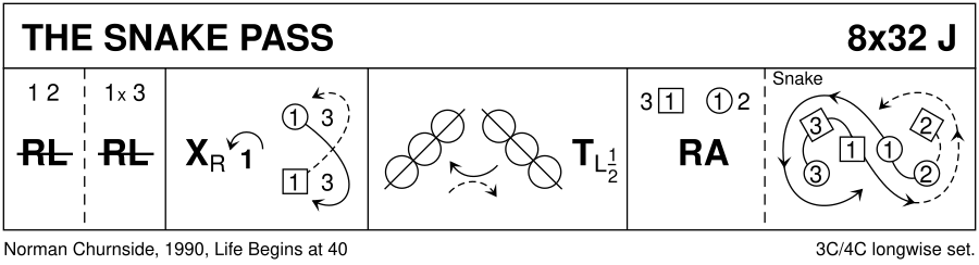 1– : 1c+2c ½R&L ; 1c+3c ½R&L (2x,3x,1) 9– : 1c cross RH, cast up (3c down) ; ½ Fig8 down to face 1cnrs 17– : ½Reel4 with 1cnrs, pass Lsh ; ½Reel4 with 2cnrs with fast ½turn LH into 25– : 3c+1W & 1M+2c RHA ; Lsh Snake Pass (unwind the RHA, 1c leading, pass other snake Lsh through 2plx and chase cclw to) (2,1,3)