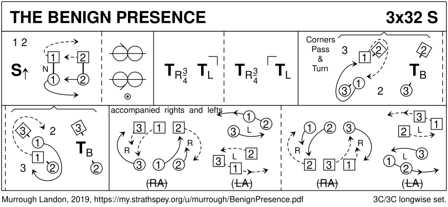 1- : 1c+2c set adv & face up NHJ | 1c cast off **while** 2c dance up & face out ; ½ mirror reels3 on the sides, 1c start in and down (3,1,2) 9- : 1c turn P ¾ RH | 1cnr LH ; P ¾ RH | 2cnr LH to face 3cnr 17- : 1c+3cnrs pass and turn BH, 1c end passing RSh ; repeat with 4cnrs, 1c end on own sides (3,1,2) 25- : *«3W+1W & 1M+2M accompanied R&L with 3M & 2W»:* 3c+1W & 1M+2c ½ RHA in 1pl & 3pl, 1c leading & ending outside 2M/3W | M & W ½ LHA on sides ; repeat from new places, 1c now following 2M/3W (3,1,2)