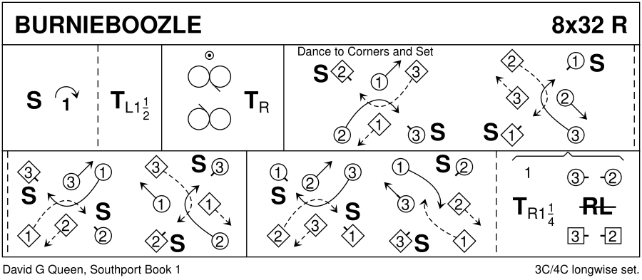 : “Dance to Each Corner and Set” (“Free” cnrs set diagonally **while{2}** centre dancers change place Rsh with the facing cnr, who in the centre pass Rsh to face next cnr on R. Repeat this five times, on alternating diagonals) ; 1c turn RH 1½ to 2pl **while{4}** 3c+2c ½ R&L starting along the sides.(2,1,3)